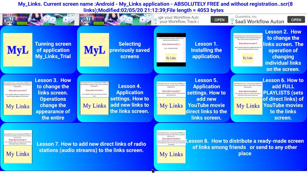 Screen: How to use the application My_Links - VIDEO LESSONS (8 video lessons - each lasting from 2 to 3 minutes, the total time of all 8 lessons is 25 minutes). Do not spare these 25 minutes - watch the video course and you will understand the advantages of the proposed technology on any Android device with the My_Links application (My links). Horizontal orientation. To DOWNLOAD, click on the screen image.